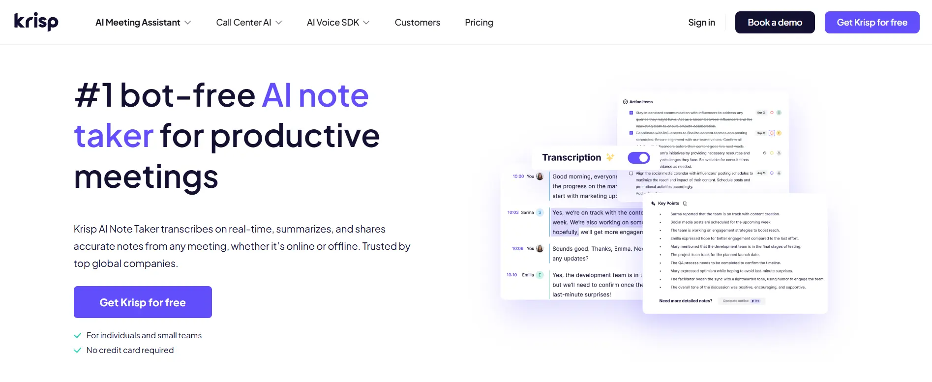Krisp eliminates the need for manual note-taking during calls, allowing team members to focus on the conversation rather than scrambling to write everything down. The AI assistant joins your meetings and produces accurate transcripts along with concise summaries of key discussion points.